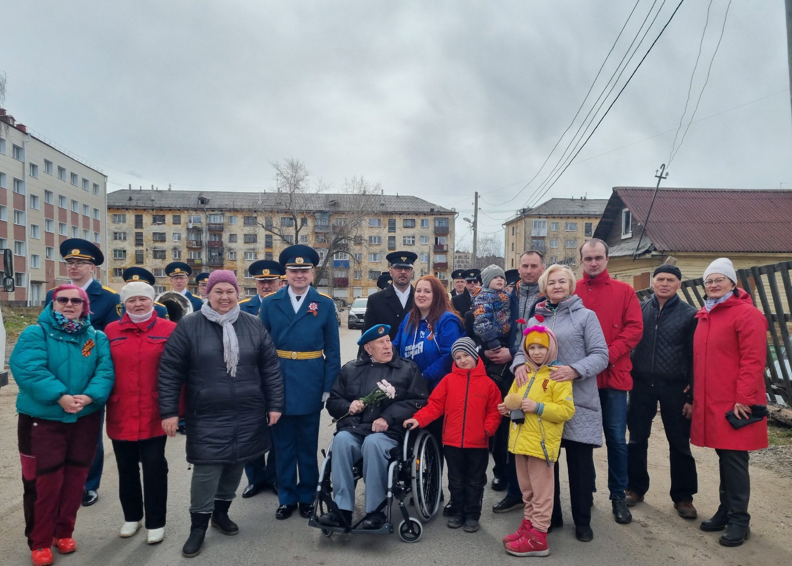 Антон Ананьин (шестой справа, держит на руках младшего сына) с дедушкой, ветераном Великой Отечественной войны Рудольфом Федоровичем Кротовым и мамой (третья слева в фиолетовой шапке и черной куртке). Представители партии «Единой России» навестили Рудольфа Александровича с военным оркестром и поздравили с наступающим Днем Победы, 8 мая 2023 года