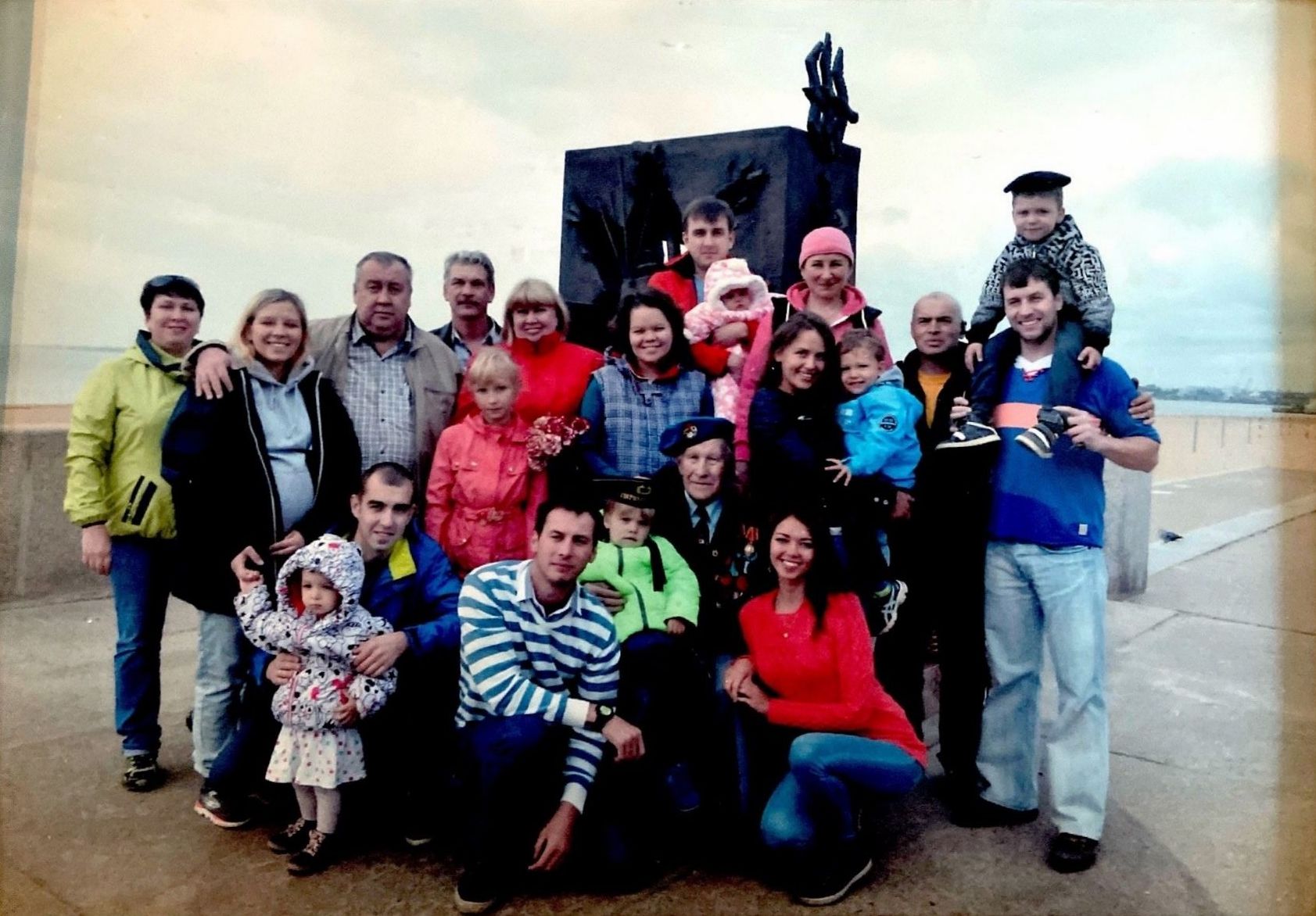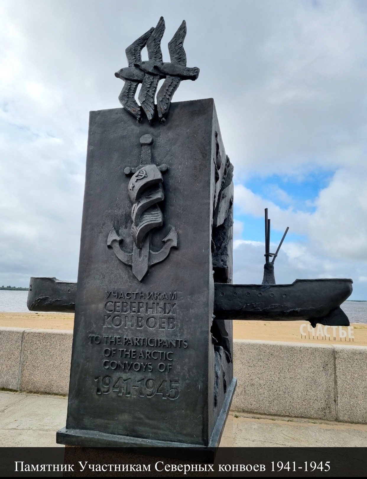 Антон Ананьин (в первом ряду в полосатом свитере) с дедушкой, ветераном Великой Отечественной войны Рудольфом Федоровичем Кротовым (посередине) и семьей у памятника «Участникам Северных конвоев 1941- 1945 гг.», Архангельск, сентябрь 2015 года. Памятник открыт на площади Мира в Архангельске 31 августа 2015 года. Это место выбрано неслучайно — именно здесь на рейде Северной Двины встали на якорь корабли и суда первого союзного конвоя «Дервиш». Памятник высотой около двух метров выполнен из бронзы на гранитном постаменте. В годы Великой Отечественной войны Архангельск был основным портом, через который поступала помощь из Европы и Америки