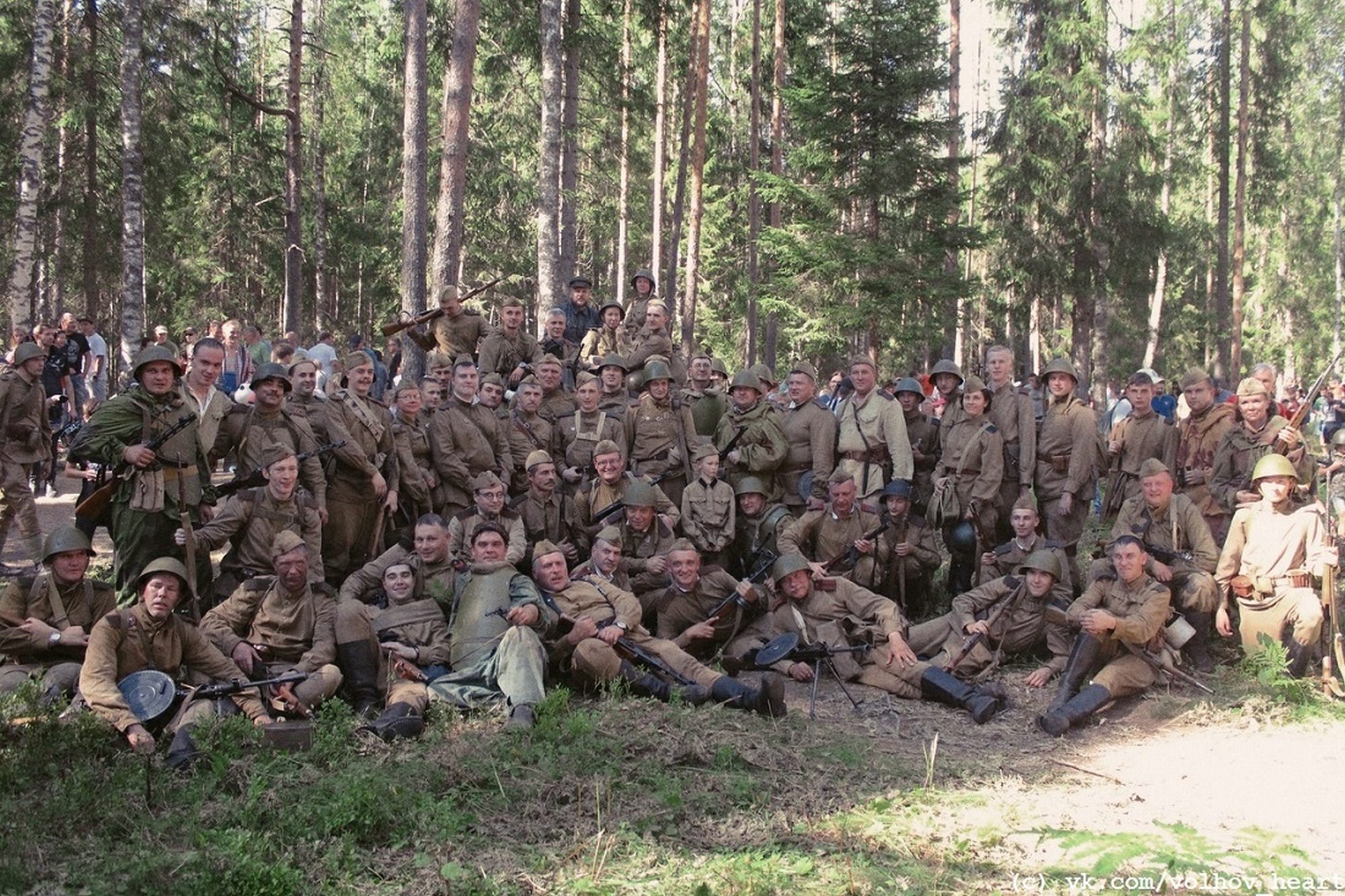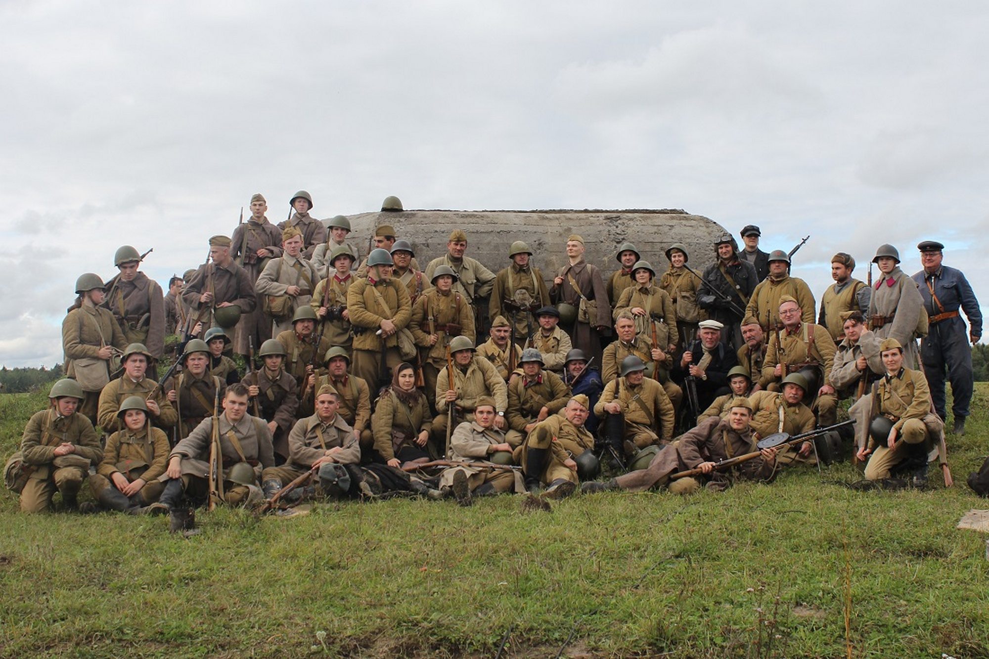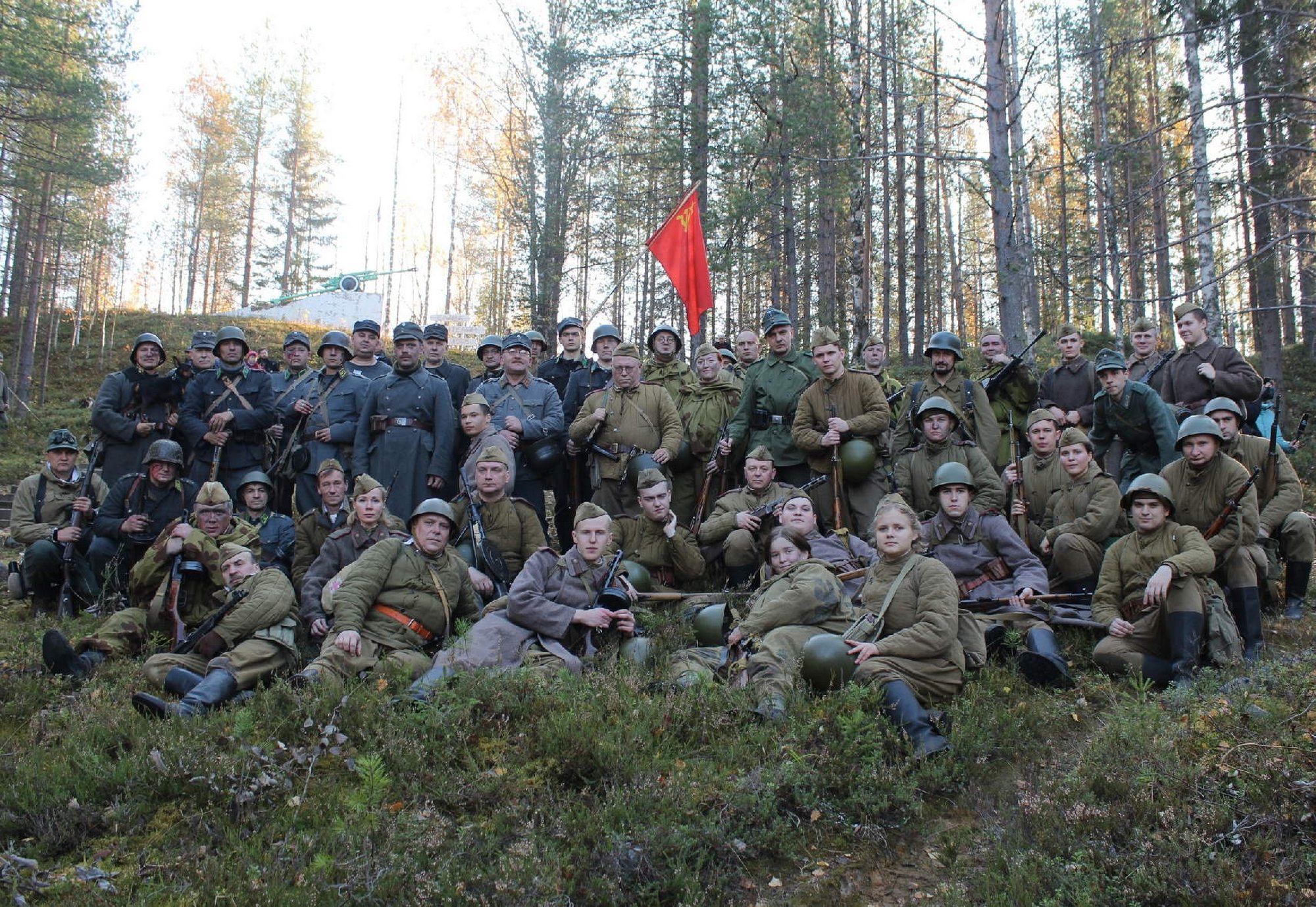 Николай Кицеров (в первом ряду третий слева) на военно-исторической реконструкции ко Дню освобождения Калевалы от фашистских захватчиков в годы Великой Отечественной войны, Республика Карелия, 2021 год