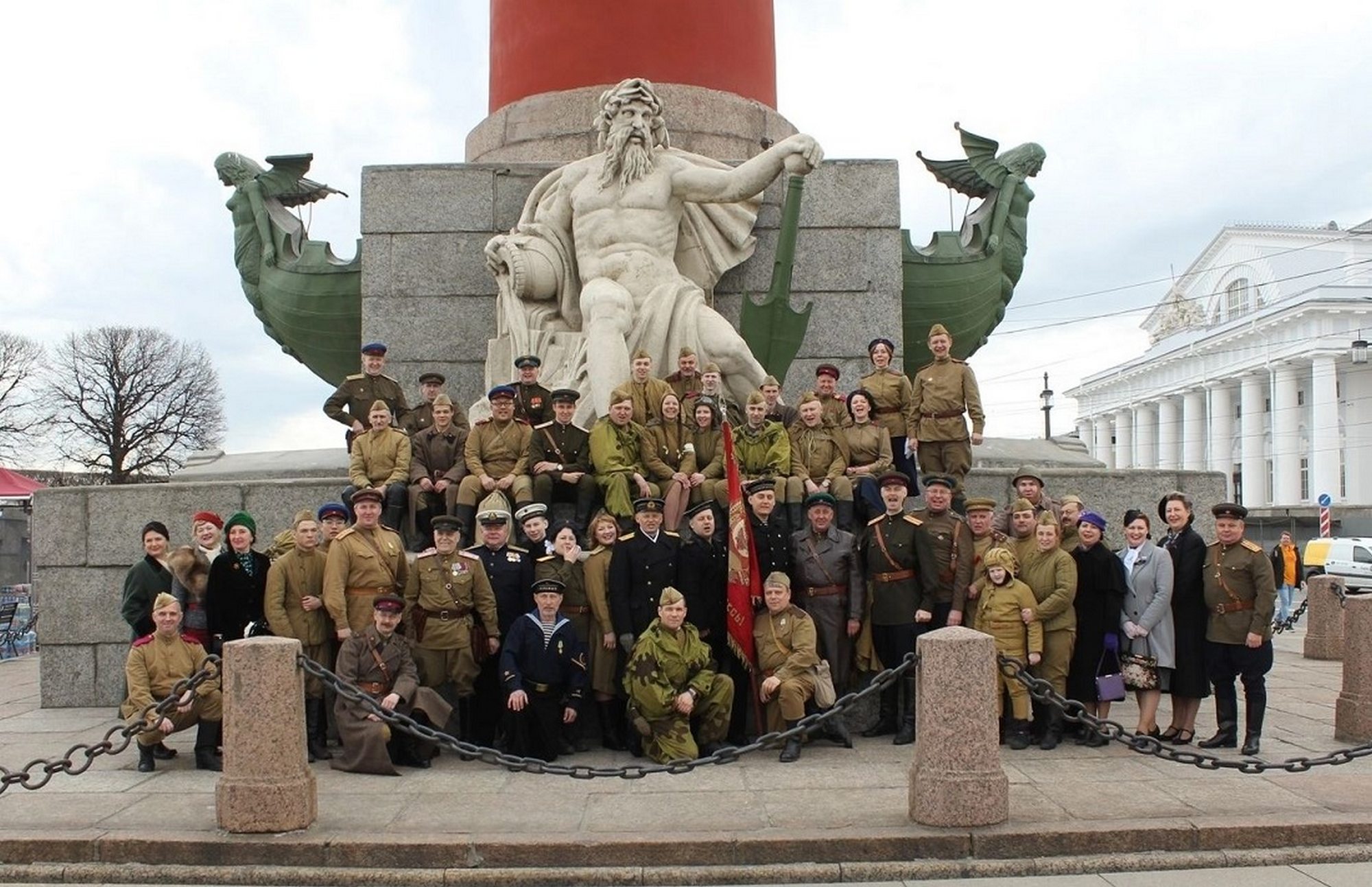 Николай Кицеров (первый ряд, справа от знамени) в составе участников автопробега ретро-машин, посвященного Дню Победы, на Стрелке Васильевского острова, Санкт-Петербург, 2024 год