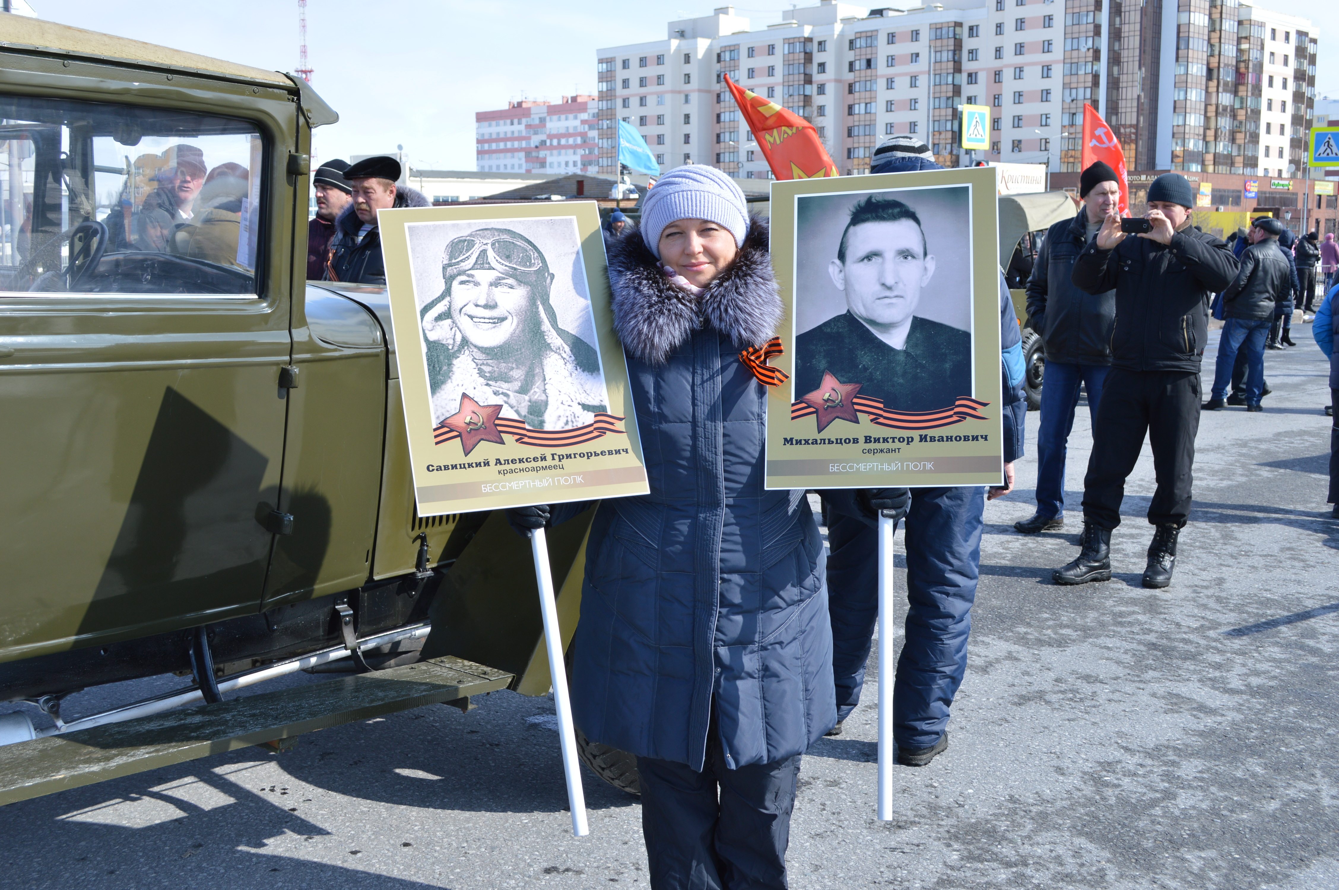 Ирина Кузьмина на акции «Бессмертный полк» с фотографией своих дедов. Слева — Алексей Григорьевич Савицкий, дед по маминой линии, справа — Виктор Иванович Михальцов, дед по папиной линии. Новый Уренгой, 9 мая 2015 года