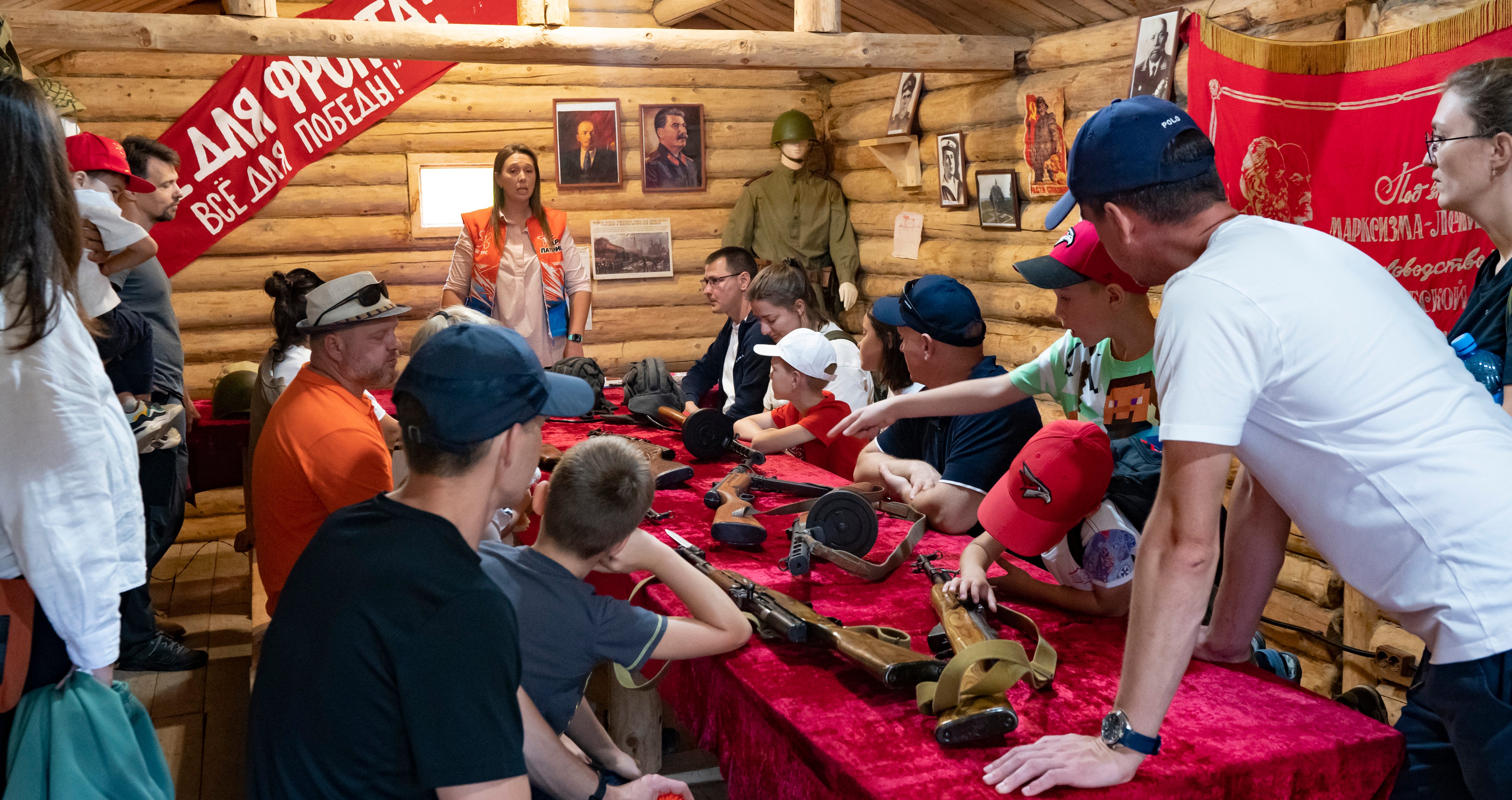 Александр Лапин (в третьем ряду второй слева) на экскурсии в партизанской деревне времен Великой Отечественной войны, военно-патриотический парк «Патриот» на аэродроме Пушистый, Корсаковский район, 16 сентября 2023 года