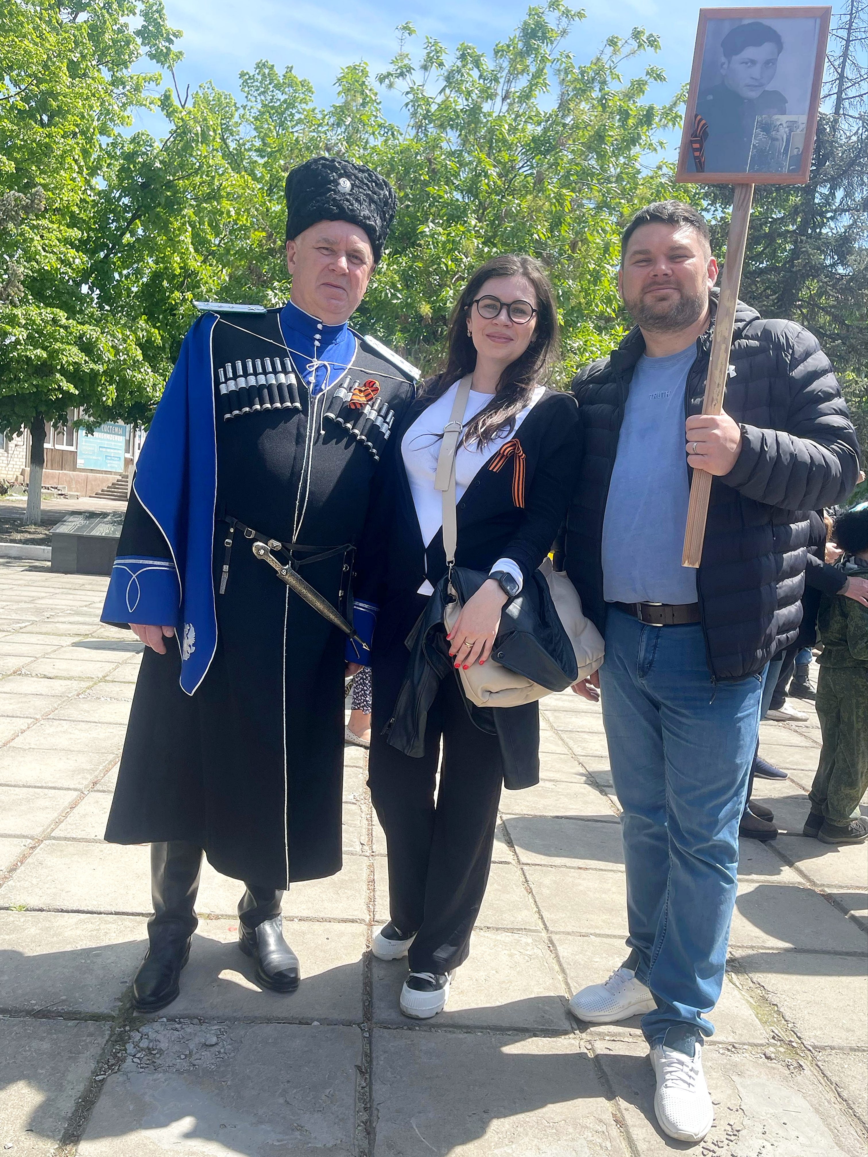 Игорь Царук (справа) с сестрой — рядовой запаса медицинских войск Софьей Дувановой — и отцом Николаем Царуком на патриотической акции «Бессмертный полк», с. Солдато-Александровское, 9 мая 2022 года. Игорь Царук держит фото своего дедушки Василия Ивановича Платонова, участника Великой Отечественной войны, который в те годы работал машинистом тепловоза